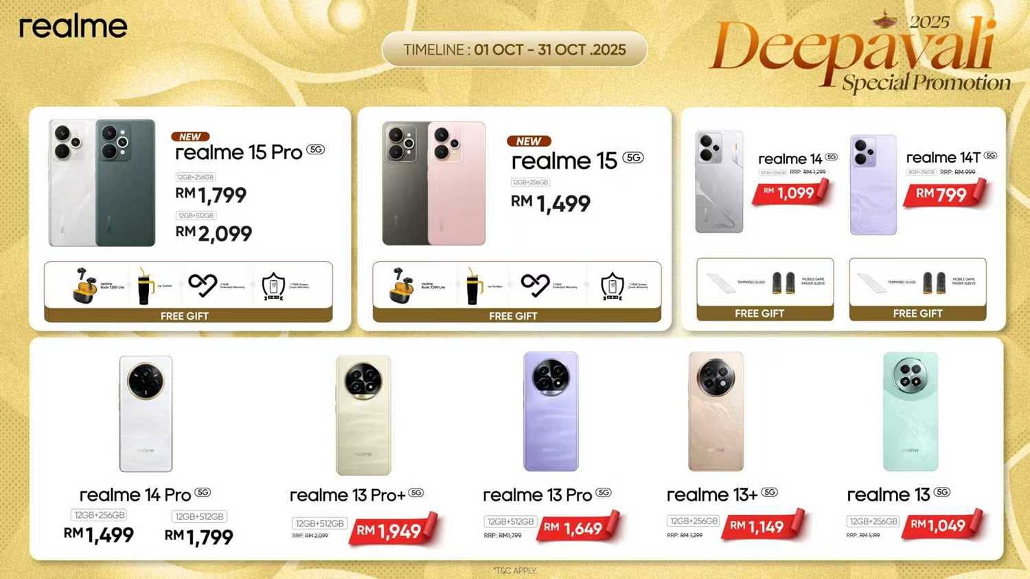 Kuala Lumpur, 7 October 2025 – realme is lighting up the festivities with its Deepavali Special Promotion, running from 1 October to 31 October 2025, bringing unbeatable deals exclusively through offline channels that fuse festive joy with cutting-edge technology. This celebration offers savings of up to RM200 off select models, paired with exciting freebies like the Watch T16C, selfie sticks, tempered glass, and gaming finger sleeves, making it the perfect time to upgrade your tech game. Whether you’re capturing the glow of Deepavali with family or powering through festive gaming sessions, realme’s innovative devices are here to make every moment shine.